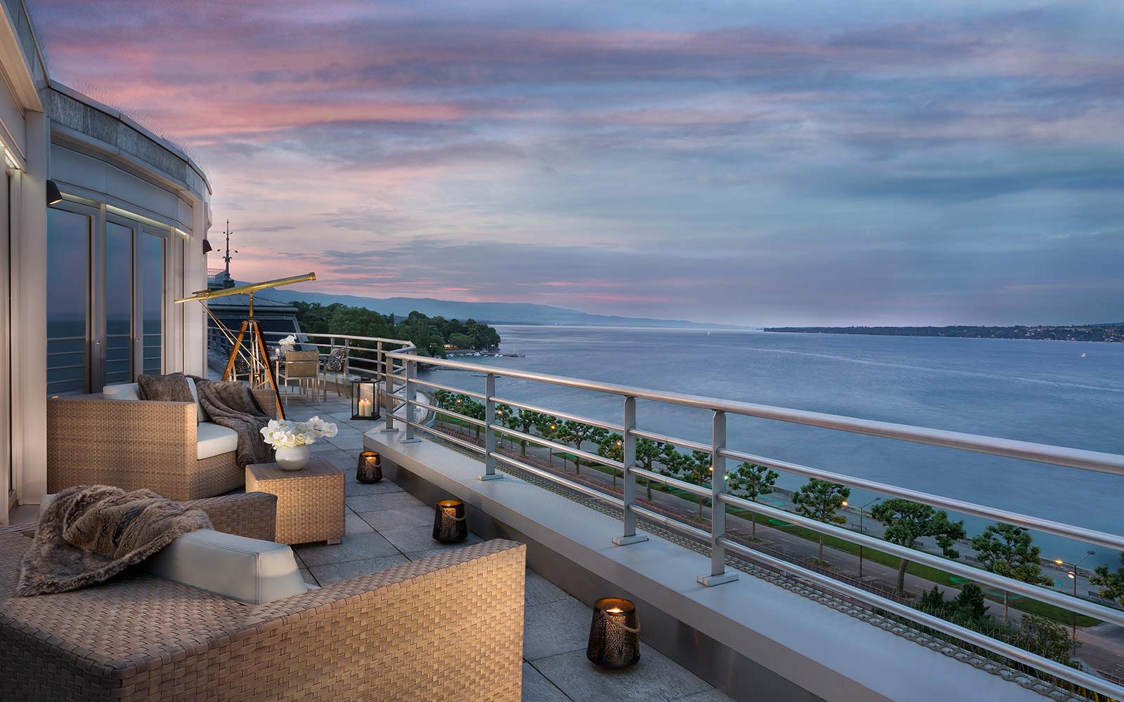 One of our favorite features of the Royal Penthouse Suite is a wraparound terrace that overlooks Geneva’s Lac Leman, complete with a telescope for stargazing on clear nights.