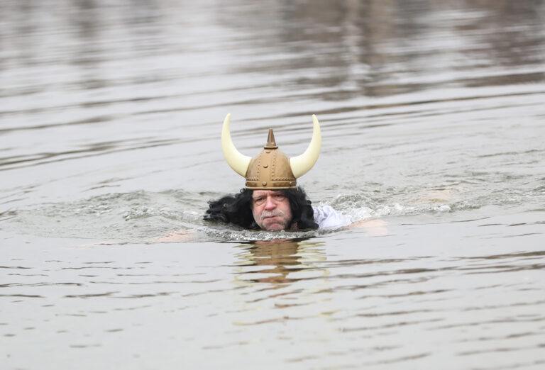 A participant attends the Winter Swimming Carnival at the Oranke Lake, northeastern Berlin, Germany, on Jan. 13, 2018. About 100 winter swimming enthusiasts and more than 1,000 visitors were attracted to the Winter Swimming Carnival here on Saturday.