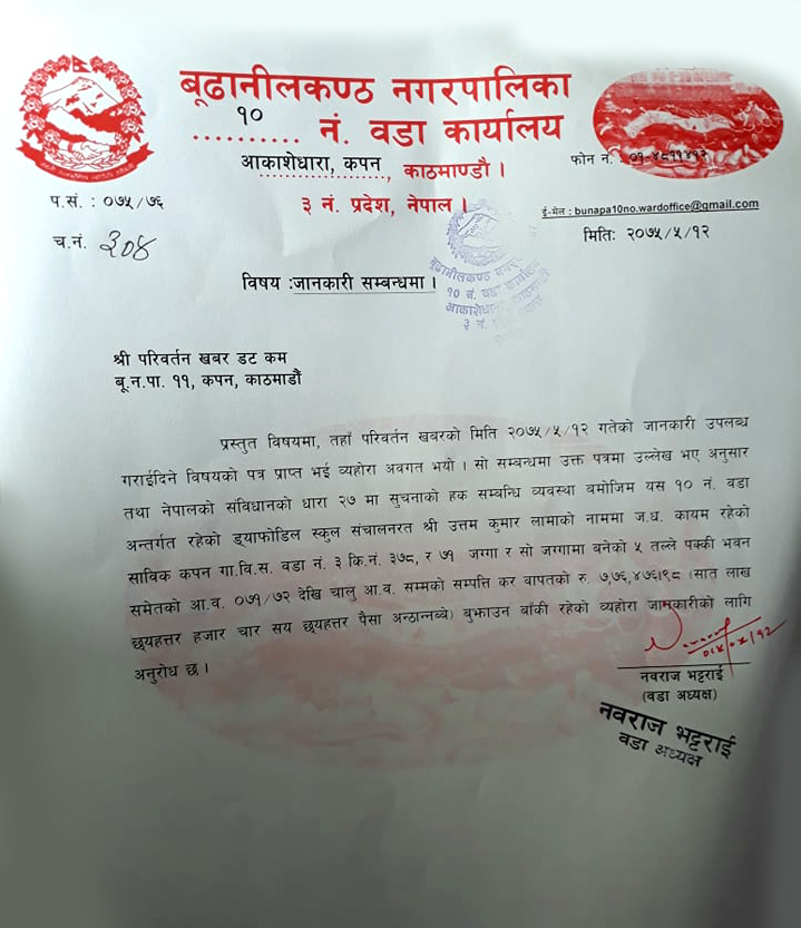 The school is located in Ward Number 10 of Budhanilkantha Municipality of Kathmandu. It owns two plots of lands — plot numbers 378 and 71 — in what was previously Ward Number 3 of Kapan Village Development Committee. But the plots are registered in the personal name of Uttam Kumar Lama, not the school. A huge five story building has been constructed on those two plots.