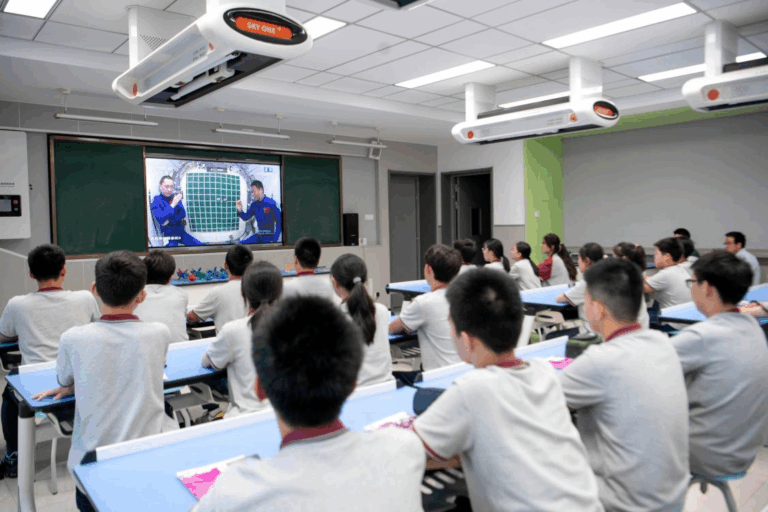 Students of a middle school in Zhang jiagang, east China’s Jiangsu province attend a science lesson live-streamed by the Shenzhou-16 crew from the Tiangong Space Station, Sept. 21, 2023. (Photo/Ren Guangzhen)