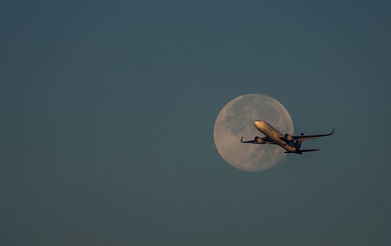 A commercial plane flies over Bogota, as a “super blue moon” is seen on February 1, 2018.