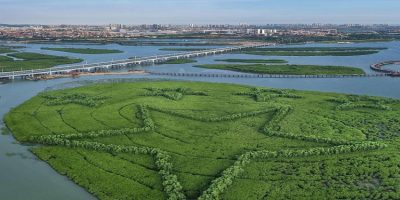 By Liu Fawei, In Xiamen, southeast China’s Fujian province, a pattern resembling a heart and five pentagrams formed by mangroves with different heights stretches on the sea beside a bridge