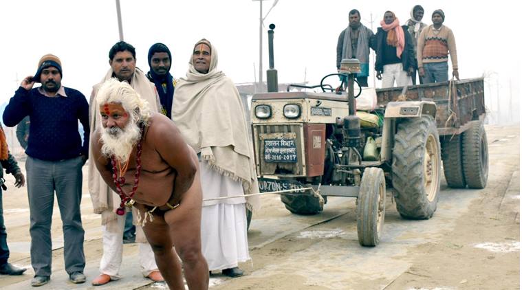 Most of us might have seen people pulling heavy vehicles like trucks and tractors using their teeth and even hair. However, recently a picture surfaced on the Internet that left many people stunned after the annual Magh Mela that is organised on the banks of Ganga in Allahabad. An elderly ascetic pulled a tractor using nothing but his penis! Yes, you read that right.