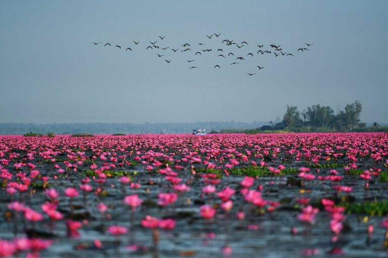 China Xinhua, Jan 10, 2018 : Another look of winter: More than 1 mln water lilies are in blossom on the Han Kumphawabi lake in northeast Thailand’s Udon Thani Province. You can’t miss this.