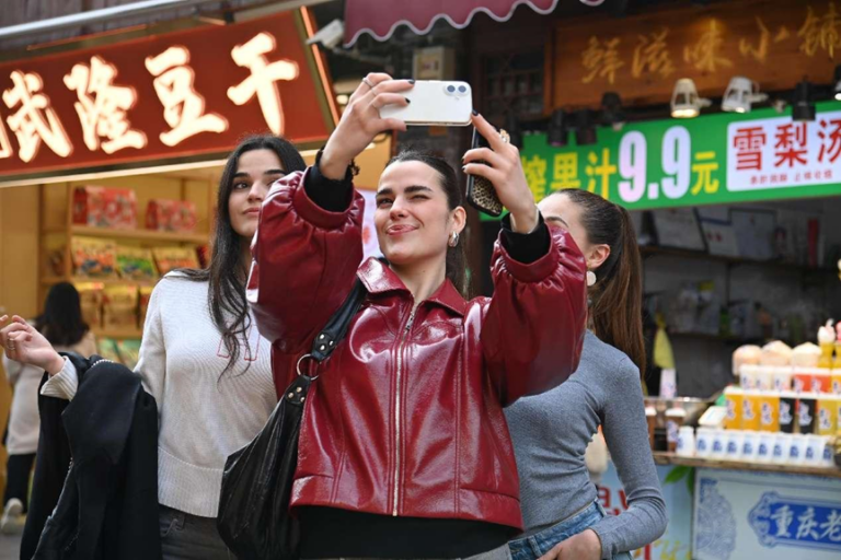Foreign tourists pose for a picture in Ciqikou Ancient Town, a tourist attraction in southwest China’s Chongqing municipality, March 19, 2025. (Photo by Sun Kaifang/People’s Daily Online)