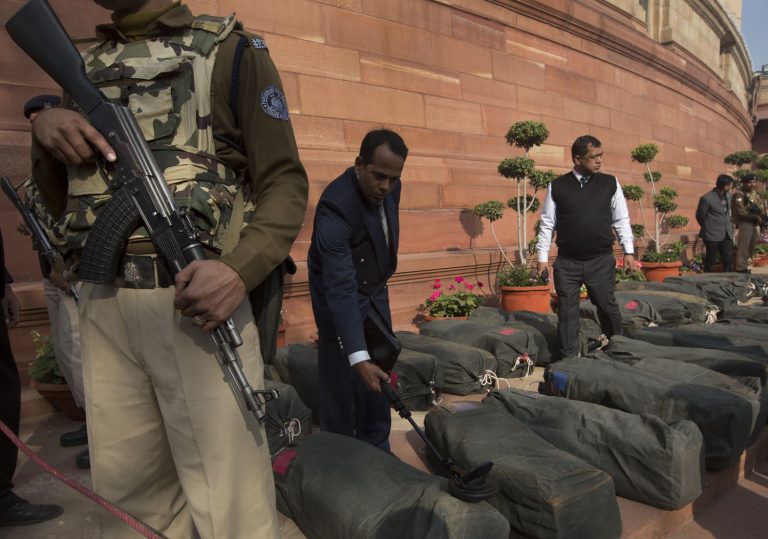An Indian security man checks bags containing the copies of the federal budget for the year 2018-19, that will be distributed to lawmakers at the parliament house in New Delhi, India, Thursday, Feb. 1, 2018.