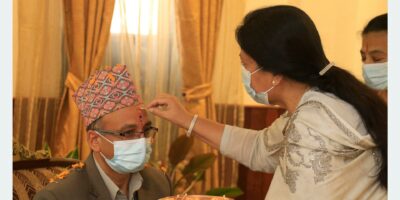 6 November 2021, Kathmandu President Bidya Devi Bhandari has offered tika to her younger brother Degendra Pandey at the auspicious hour of 11:02 am on the Bhai Tika, the main
