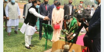22 March 2021, Dhaka President Bidya Devi Bhandari has planted saplings at the National Martyrs Memorial in Sabhar in Dhaka, the capital of Bangladesh, this morning. President Bhandari is in
