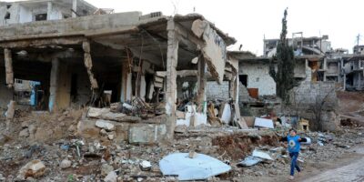 DAMASCUS, Jan 7, 2018 (Xinhua): A boy runs past a destroyed building in the war-ravaged city of Zabadani, northwestern countryside of Syria’s Damascus near the Lebanese border, on Jan. 6,