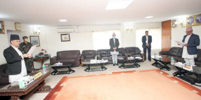 7 April 2020, Kathmandu Newly appointed governor of Nepal Rastra Bank (NRB), Maha Prasad Adhikari on Tuesday took the oath of office and secrecy from Chief Justice Cholendra Shamsher Rana.