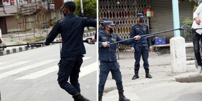 27 March 2020, Kathmandu Social distancing is one of the effective measures to combat the spread of COVID-19. Nepal Police has started exhibiting this measure to restrict on lockdown violators.