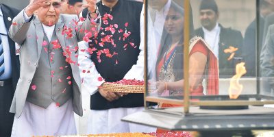 New Delhi, India, April 7 Prime Minister KP Sharma Oli, who is on a state visit to India, visited the mausoleum of Mahatma Gandhi at Rajghat and paid tributes to