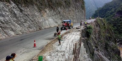 A tractor is seen parked on a side road as manual workers are engaged in their work along the Narayangadh-Muglin road section, in Chitwan district, on Wednesday, June 6, 2018