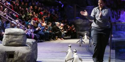 CHICAGO, Feb. 4, 2018 A staff plays with penguins at the Shedd Aquarium in Chicago, the United States, on Feb. 2, 2018. The aquarium contains 32,000 animals and attracts nearly