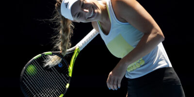 AP, Jan 14, 2018 Denmark’s Caroline Wozniacki reacts as her hair is tangled in her racket during a practice session ahead of the Australian Open tennis championships in Melbourne, Australia,