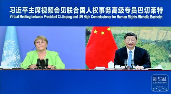 Chinese President Xi Jinping met via video link with UN High Commissioner for Human Rights Michelle Bachelet in Beijing on May 25. During the meeting, he expounded on major issues regarding China’s human rights cause in the context of China’s history and culture and reaffirmed the principled position of the Communist Party of China (CPC) and the Chinese government in upholding and protecting human rights in all areas.