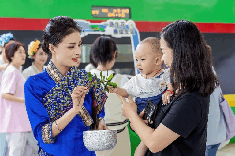 An attendant in traditional costumes of a passenger train from Kunming to Vientiane along the China-Laos Railway extends greetings to passengers. (Photo/Chen Chang)