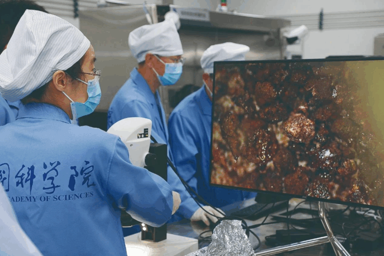 The Chang’e-6 samples exhibit unexpected physical properties compared to Chang’e‑5 samples. “The Chang’e‑5 samples are jet-black and nearly pure basalt, while the Chang’e‑6 samples are lighter and even whitish, due to the presence of abundant highland material composed of white anorthosite,” Wu elaborated.
