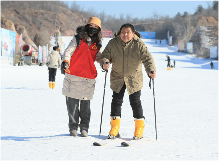 A person with disabilities learns to ski with the help of a volunteer in Chaoyang city, northeast China’s Liaoning province, Jan. 20, 2022. (Photo by QiuYijun/People’s Daily Online)
