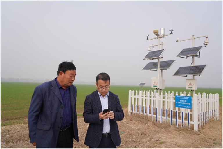 A staff member talks with a grain grower about his experience of using an application designed for helping farmers with agricultural production, in a wheat field in Changshan township, Zouping city, east China’s Shandong province. (Photo by Li Xiaowei/People’s Daily Online)