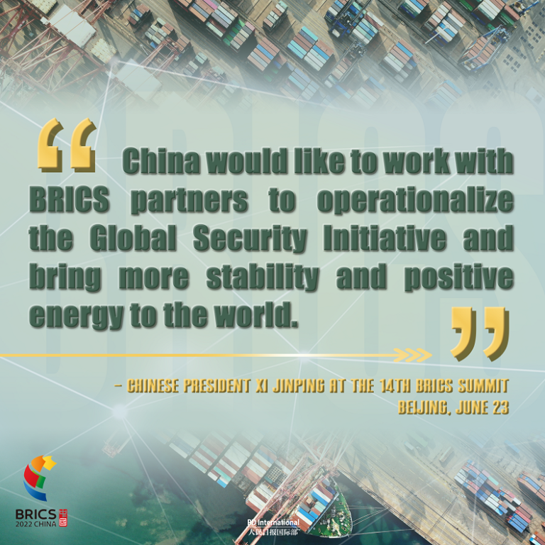 “China would like to work with BRICS partners to operationalize the Global Security Initiative and bring more stability and positive energy to the world.”: President Xi Jinping