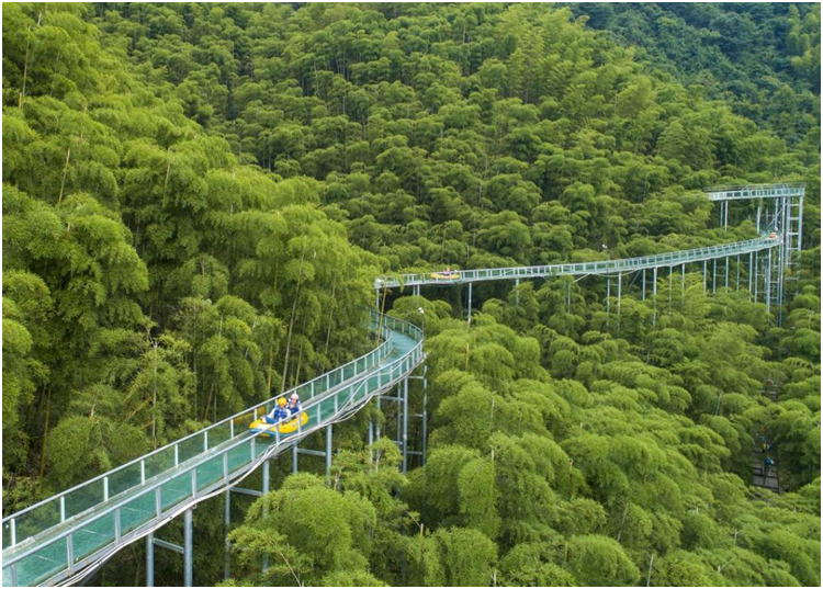 Tourists experience water slide over a bamboo forest in Shangshu township, Anji county, Huzhou, east China’s Zhejiang province, July 27, 2022. (Photo by XiaPengfei/People’s Daily Online)