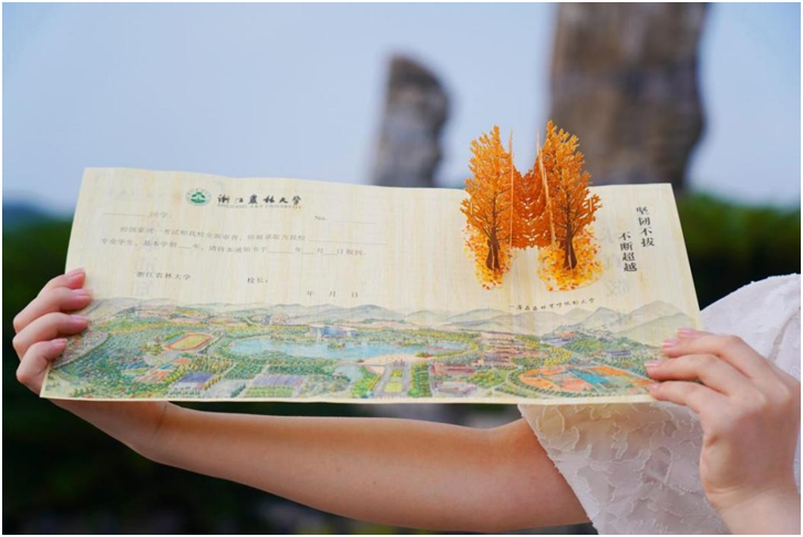 Photo taken on July 6, 2022 shows an acceptance letter made from thin bamboo slice issued by Zhejiang Agriculture and Forestry University. (Photo by ChenShengwei/People’s Daily Online)