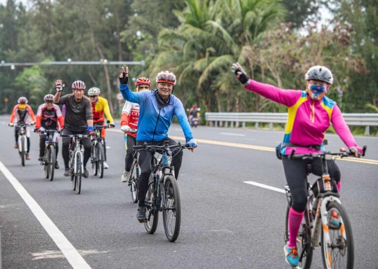 Riders travel along a picturesque tourism highway in Tanmen town, Qionghai, south China’s Hainan province. (Photo by Meng Zhongde/People’s Daily Online)