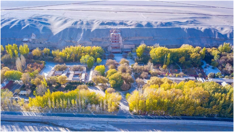 An aerial photo of the Mogao Grottoes in Dunhuang, northwest China’s Gansu province. (Photo by Wang Binyin/People’s Daily Online)