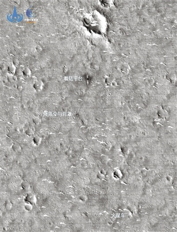 The orbiter of China’s Tianwen-1 Mars mission, the country’s first artificial Mars satellite, lately sent back new images of the inspection area of the Zhurong Mars rover with a resolution of 0.5 meters when it traveled past the area again at the periareion, the point in the orbit that is closest to Mars. Track marks left by the Mars rover are clearly visible in the pictures.