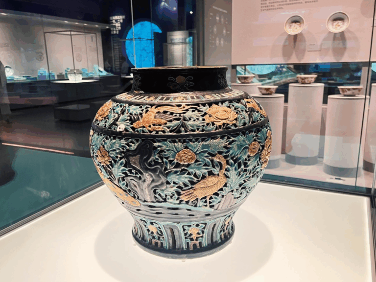 Inside the gallery, a large gilt-decorated Fahua jar, adorned with peacock-and-peony motifs in openwork designs, stands in quiet magnificence. Its brilliant glaze, intricate latticework, and exquisite gilding capture the eye. Yet as recently as last year, this masterpiece still lay undisturbed on the seabed, some 1,500 meters below the surface, alongside more than 100,000 pieces of porcelain and ebony logs.