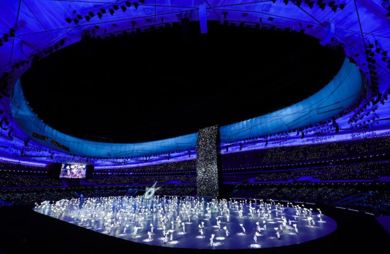 It glittered with Chinese culture from the very start when a 24-second countdown performance was staged, with each second representing one of the 24 solar terms. Then a three-dimensional cube that resembled a block of ice was gradually broken and turned into crystal clear Olympic rings. Children from rural areas in north China’s Hebei province sang the Olympic Anthem wearing stylized tiger heads on their costumes and shoes to mark the Year of the Tiger.