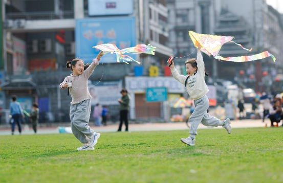 Children fly kites on a square in Tongdao Dong autonomous county, central China’s Hunan province, Feb. 19, 2023. (Photo by Su Yongzhu/People’s Daily Online )