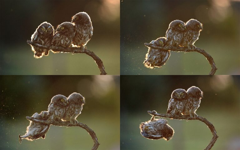 The port folia prize for these hilarious photographs of an owl struggling to keep its footing on a tree branch.