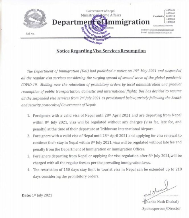 Foreigners with a valid visa of Nepal till 8th April 2021 and are departing from Nepal by July 8 will get their visa regulated without any charges and those foreigners with a valid visa of Nepal till 8th April and apply for visa renewal to lengthen their stay in Nepal within July 8 will also get late fee and penalty exempted.