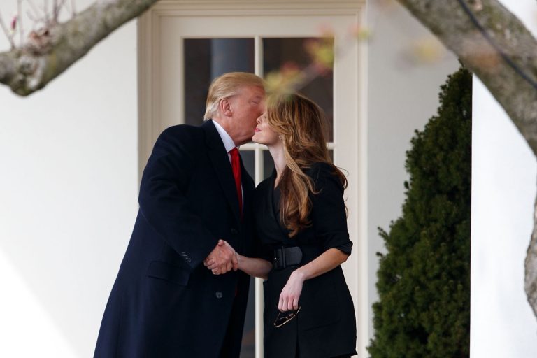 U.S. President Donald Trump (L) kisses outgoing White House Communications Director Hope Hicks on the West Wing Colonnade before departing from the White House in Washington D.C., the United States, on March 29, 2018.