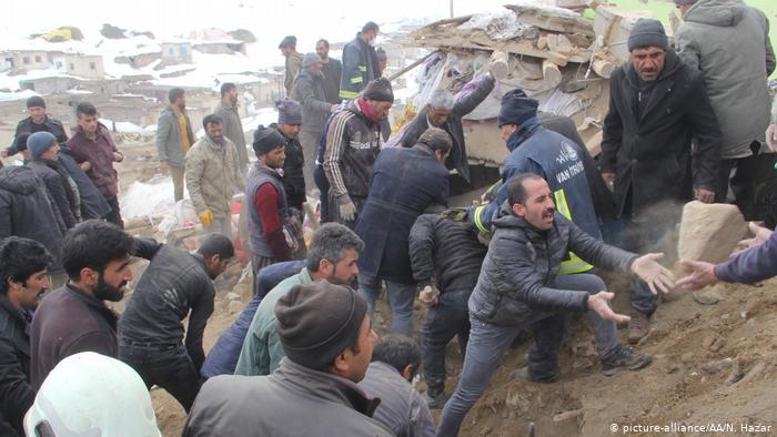 The Turkish TV footage showed people digging through rubble with shovels as well as crumbled exterior walls of homes, cracks in roads and residents outside in the snow.