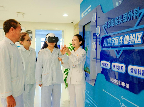 At Bishan Hospital of Chongqing Medical University, medical staff assist patients in experiencing a glasses-free 3D educational video featuring an AI-powered digital doctor. (Photo by Hu Yuejian/People’s Daily Online)