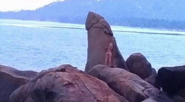 A FEMALE tourist has sparked anger after she stripped naked and rubbed herself against a mythical rock shaped like a penis.