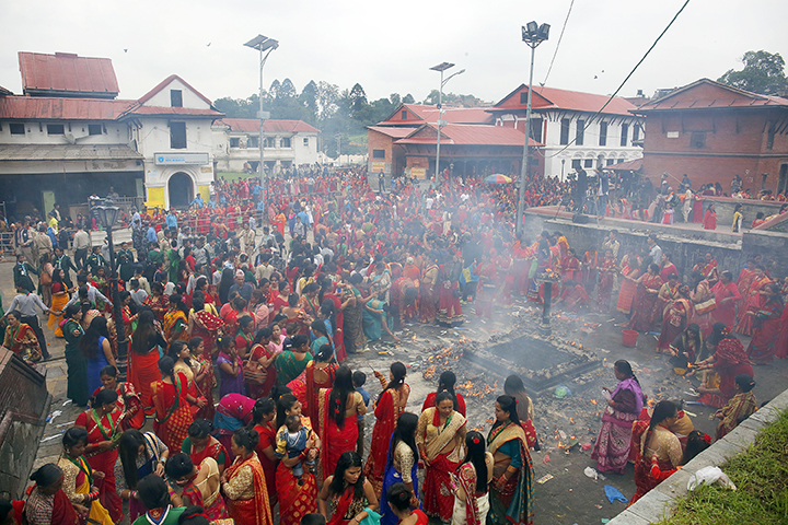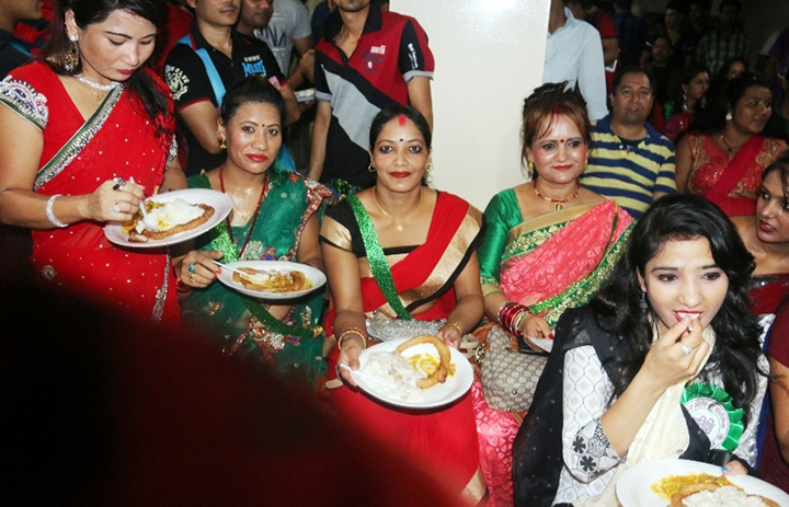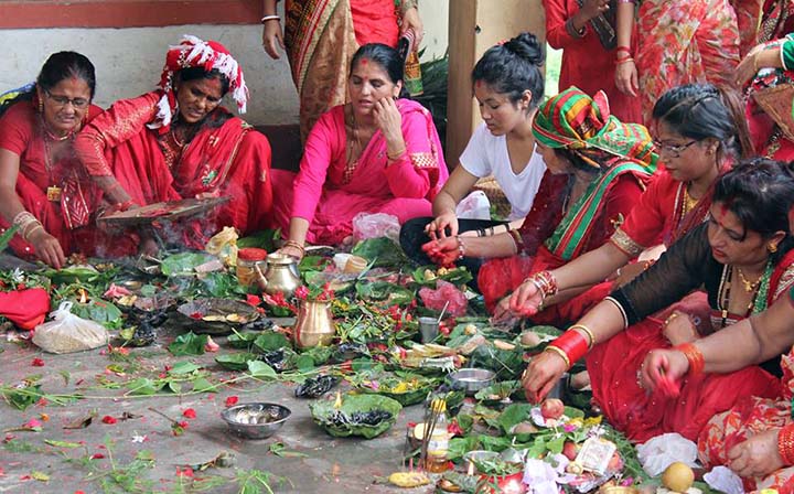 Teej is a common name for festivals that are celebrated in Nepal in order to welcome and celebrate the arrival of monsoon after a season of summer heat. The festival is marked by singing, dancing, fasting and prayers by women for the prosperous and welfare of her family. It is such a festival observed for marital happiness, well-being of spouse and children and purification of own body and soul. It is fascinating to see women, in “Red” costumes and attire dancing and singing on the street, going to temple in holy and fasting mood. Teej, also known as Haritalika teej is celebrated by Nepali Hindu women all across the world.