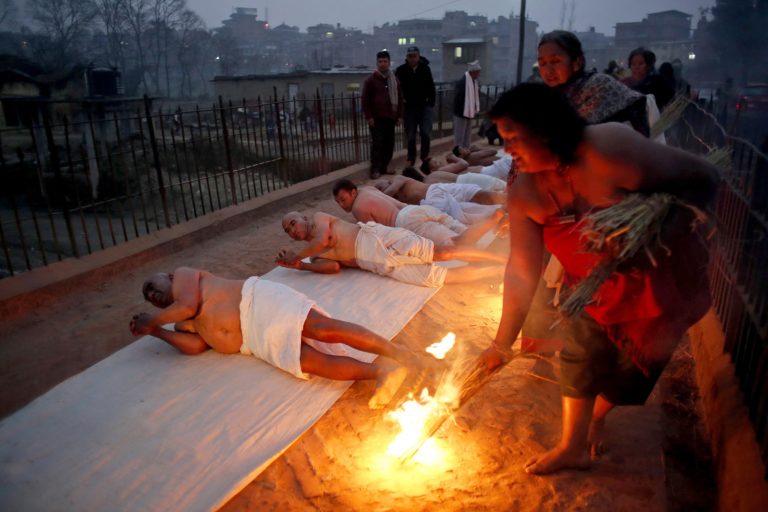 Hindu devotees roll on the ground on the banks of Hanumante River on the last day of Madhav Narayan festival in Bhaktapur, Nepal. During the festival, devotees recite holy scriptures dedicated to Hindu goddess Swasthani and Lord Shiva.