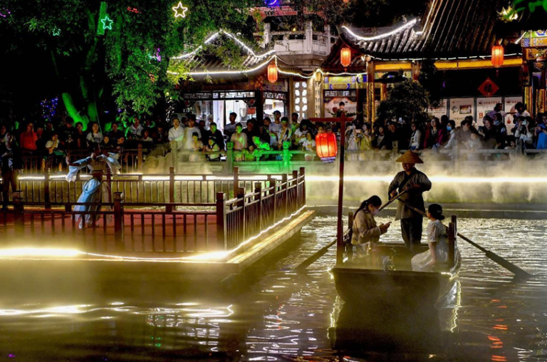 At the Liangjiang International Film City, a tourist attraction in southwest China’s Chongqing municipality, a live-action performance was staged at night during the holiday. Tourists were wandering there in traditional costumes to experience the charm of the local culture.