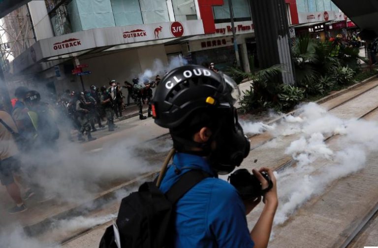 Police in Hong Kong fired several tear gas shells in a shopping district as people took to the streets to march against Beijing’s proposed tough national security legislation for Hong Kong.