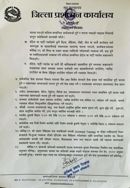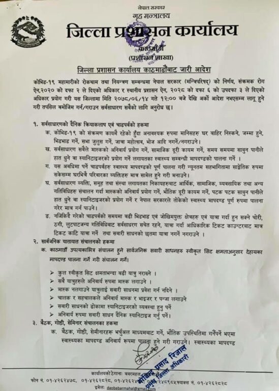 The directive signed by Kathmandu’s Chief District Officer Govinda Prasad Rijal has tightened several previously granted freedoms and would be in effect until the DAO issues next notice.