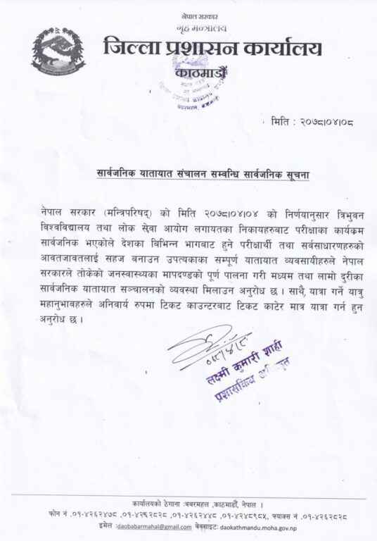 “In order to facilitate the movement of the examinees and the general public, the concerned are requested to make arrangements for the operation of medium and long-distance public transport in full compliance with the health standards prescribed by the Government of Nepal,” he said.
