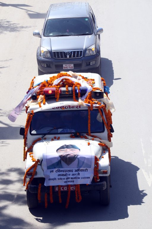 The mortal remains of Minister for Culture, Tourism and Civil Aviation, Rabindra Adhikari, who was killed in the Air Dynasty chopper crash in Taplejung Wednesday along with others six, has been brought to his home district today.