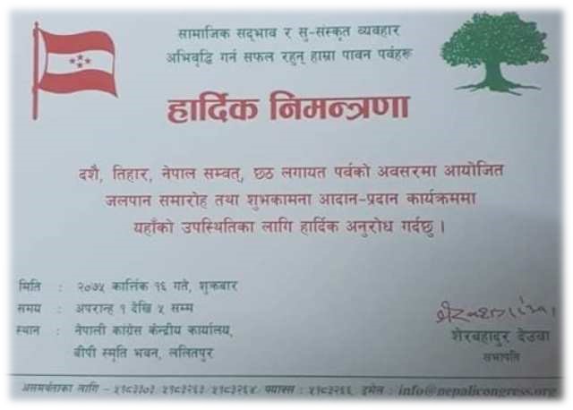 Nepali Congress had been hosting the tea reception on Kojagrat Poornima, the last day of Bijaya Dashami, every year. The annual event was postponed this year due to demise of its leader and former minister Chakra Prasad Banstola, said NC central committee member Pradeep Poudel.