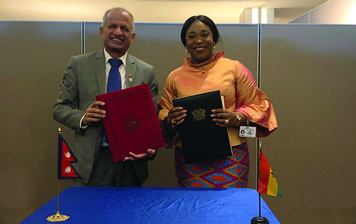 While many leaders continued their address to the General Debate in its second day, Nepali delegation to the 74th session of the UNGA took part in a series of high-level meetings on the sidelines. As part of making diplomatic relations as wider as possible, Nepal and Ghana established formal diplomatic relations. Pradeep Kumar Gyawali, Minister for Foreign Affairs of Nepal and Shirley Ayorkor Botchwey, Foreign Minister of Ghana signed a Joint Communiqué to that effect. With this development, the number of countries Nepal has established diplomatic relations has now reached 168. The two ministers also held a bilateral meeting prior to the signing of the Communiqué. They also shared the confidence that the diplomatic ties will help bring the two countries and peoples closer on the bilateral front, while continuing their collaboration at multilateral forums as mentioned in the press release issued by Permanent Mission of Nepal to the UN, New York.