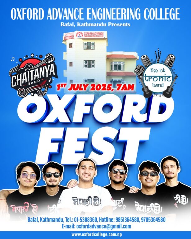 Oxford Advance Engineering College (OAEC), a prominent CTEVT-affiliated technical institution in Bafal, Kalanki, is set to host a vibrant cultural event—Oxford Fest 2082—on the morning of July 1, starting from 7:00 AM. The event promises a blend of music, dance, student performances, and academic recognition, drawing participation from across the college and local community.