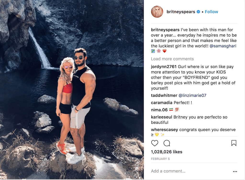 Both Spears, 36, and her fitness model boyfriend Sam Asghari, 23, are in killer shape, as was revealed in another recent Instagram post. She shared a photo of the two looking incredibly buff in front of a waterfall. The caption mentioned the couple being together over a year. Asghari enjoys spending time with Spears’ two sons, skateboarding, playing sports, and swimming in the pool, Daily Mail reported